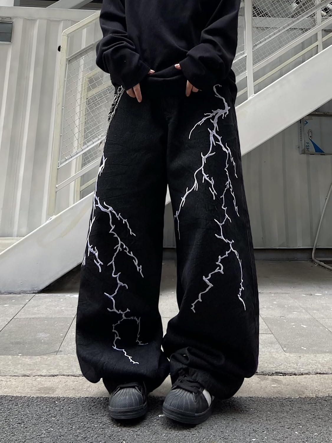 men Hip-hop Embroidered Baggy Jeans Loose Fit Denim Black Trousers