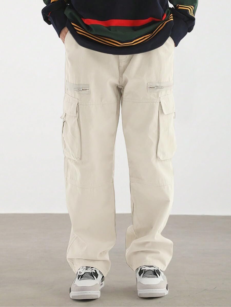 - Cargo Sweatpants: Baggy long slacks for men, solid color joggers, loose fit athletic pants, drawstring closure, adjustable elastic waistband, zippers and flap pockets decoration